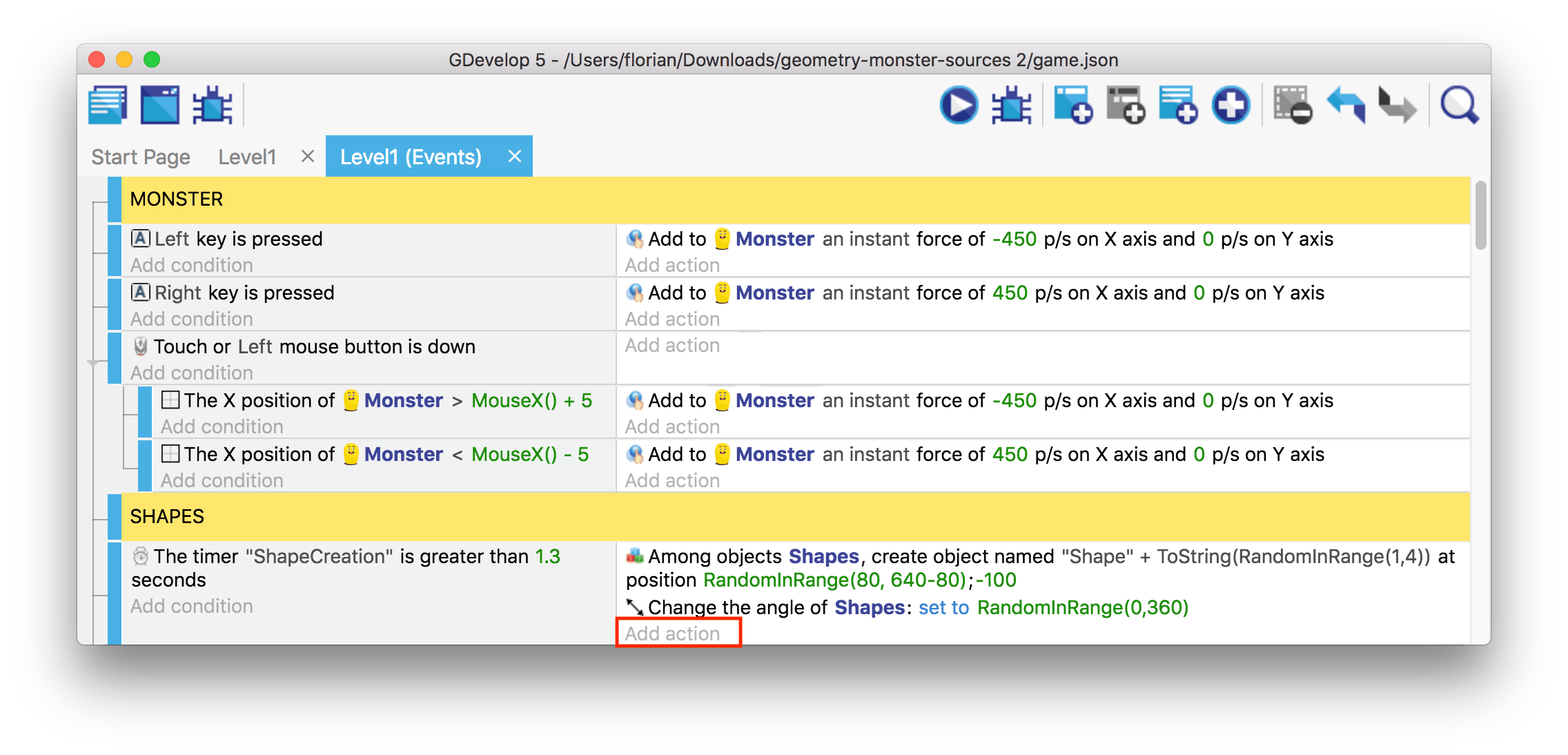 Next create a new event above the shapes event and give it the condition "at beginning of the scene", and copy/paste the earlier create "Start (or reset) a scene timer" action for "ShapeCreation" to this new event. This will start the timer at the beginning of the game in so the shapes event will trigger the first time.