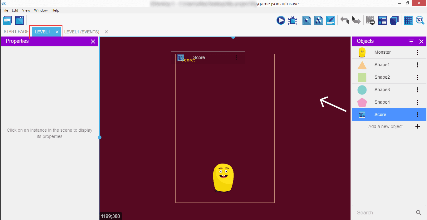 Now switch to the "Level1" tab, find the "Score" object in the right panel, and drag it onto the scene.
